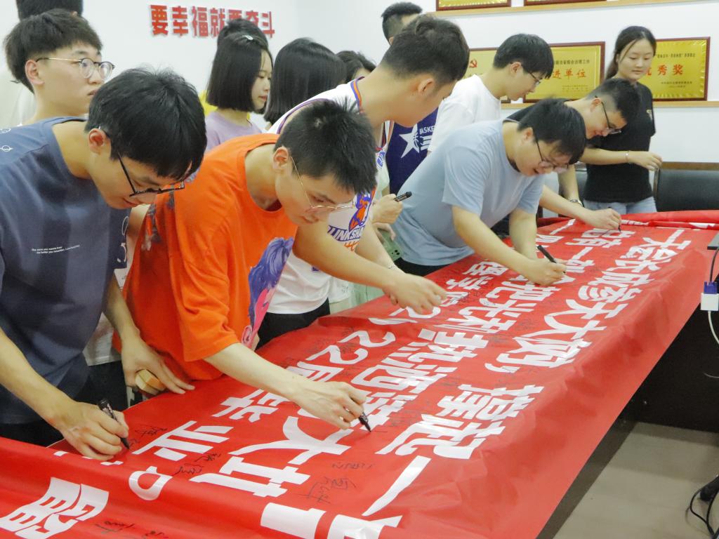 活动开始,员工会相关负责人员准备好毕业寄语横幅(习近平总书记在庆祝中国共青团成立100周年大会上的重要讲话内容),寓意毕业生茁壮成长、不断积聚能量、继续在新的起点上发光发热;毕业生们踊跃参加,纷纷在横幅上写下自己的签名,清晰的字体镌印在横幅上面,展现了毕业生对未来的向往充满更加坚定的信念。签字明志结束后,由团学相关负责人员向毕业生发放公司定制的毕业生纪念品,活动最后,毕业生集体合照留恋。