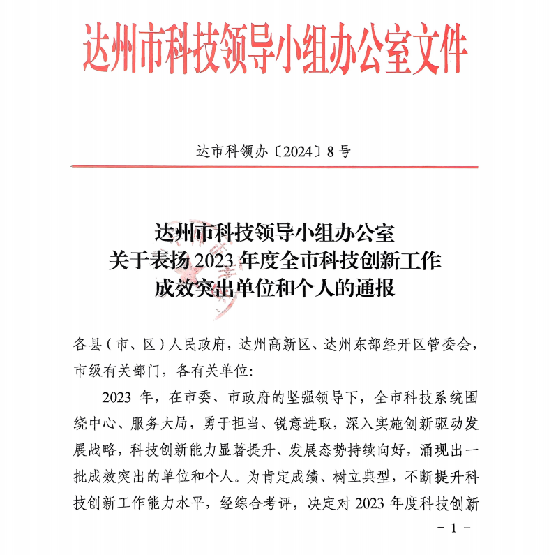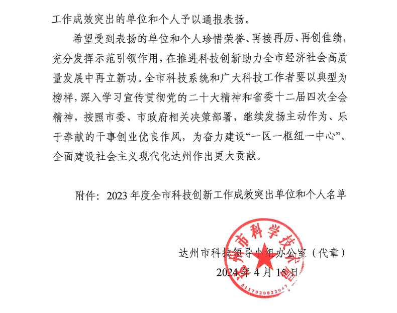 近日,达州市科技领导小组办公室下发《关于表扬2023年度全市科技创新工作成效突出单位和个人的通报》中,公司李扬磊同志荣获“2023年度全市科技创新工作成效突出个人”称号。