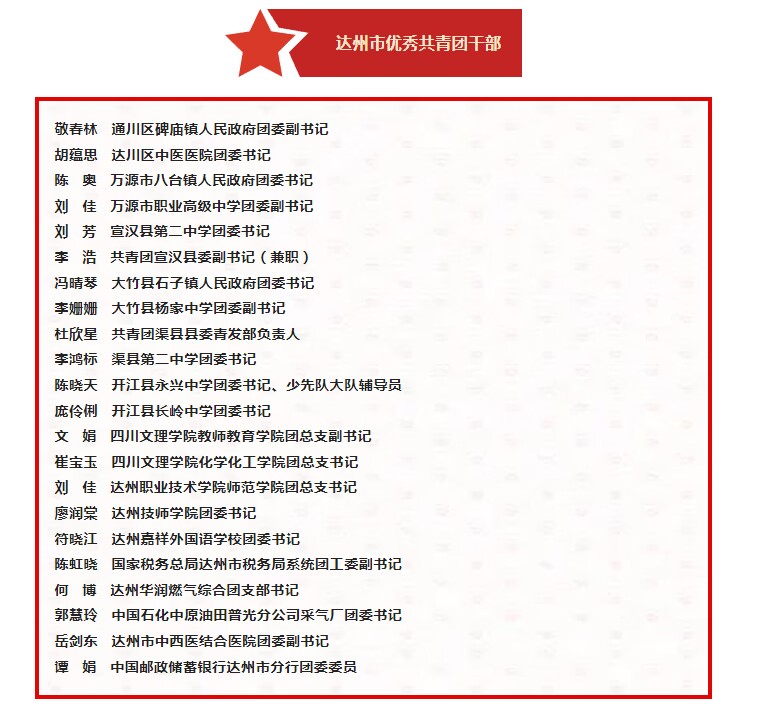 近日,共青团达州市委关于2024年达州市两红两优拟表扬对象的公示中,公司崔宝玉同志荣获“达州市优秀共青团干部”称号。