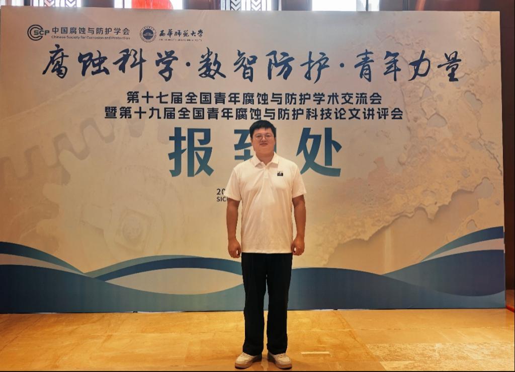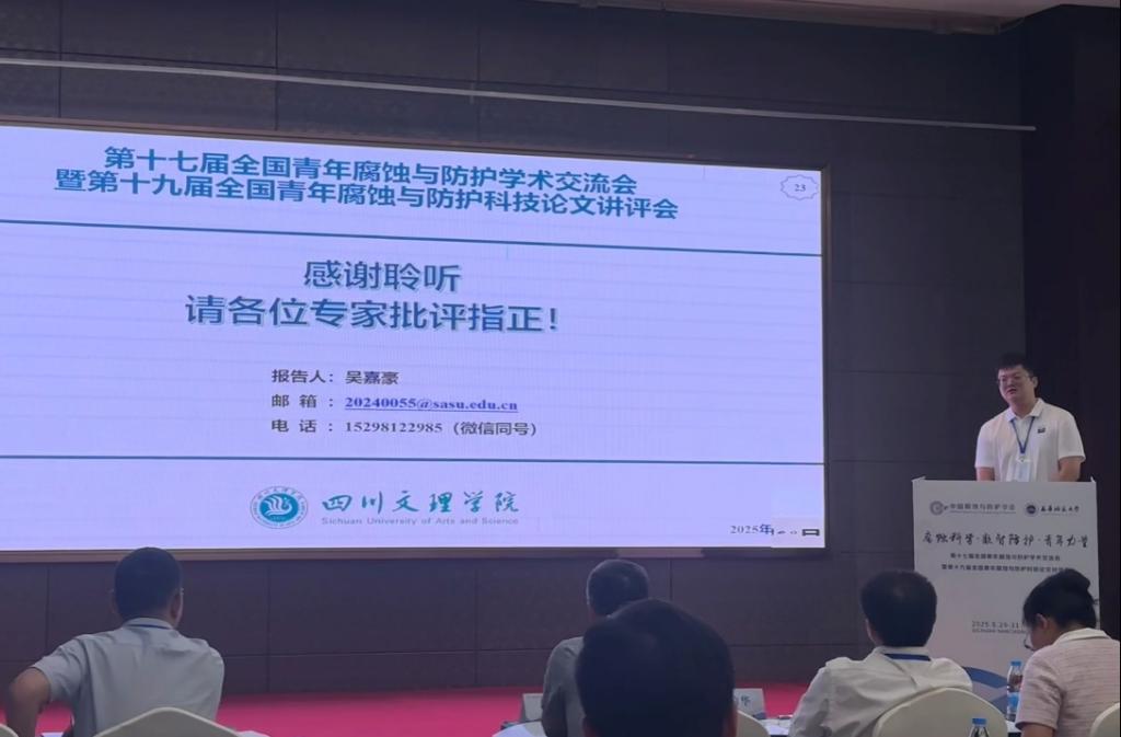 829日至31日,申搏sunbet教师吴嘉豪博士参加了在四川省南充市举办的“第十七届全国青年腐蚀与防护学术交流会暨第十九届全国青年腐蚀与防护科技论文讲评会”。