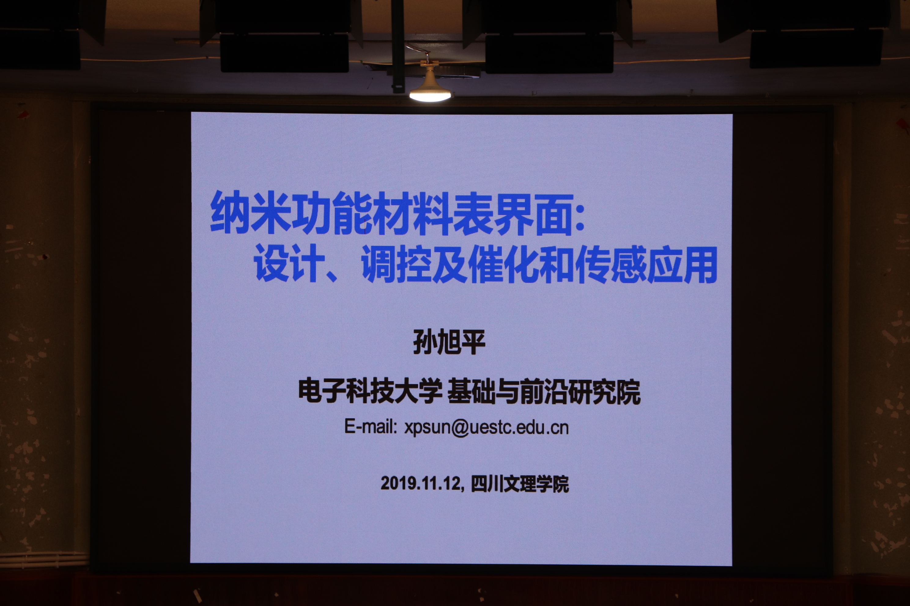 应申搏sunbet申搏sunbet邀请,电子科技大学基础与前沿研究院孙旭平教授于2019年11月12日到访申搏sunbet并进行学术交流。晚上19:00孙旭平教授在南坝校区学术报告厅做了“纳米功能材料表界面:设计、调控及催化和传感应用”的专题报告。公司党总支书记朱朝菊,副经理邓祥及申搏sunbet300余名师生代表聆听报告会。报告会由公司经理刘长路主持。