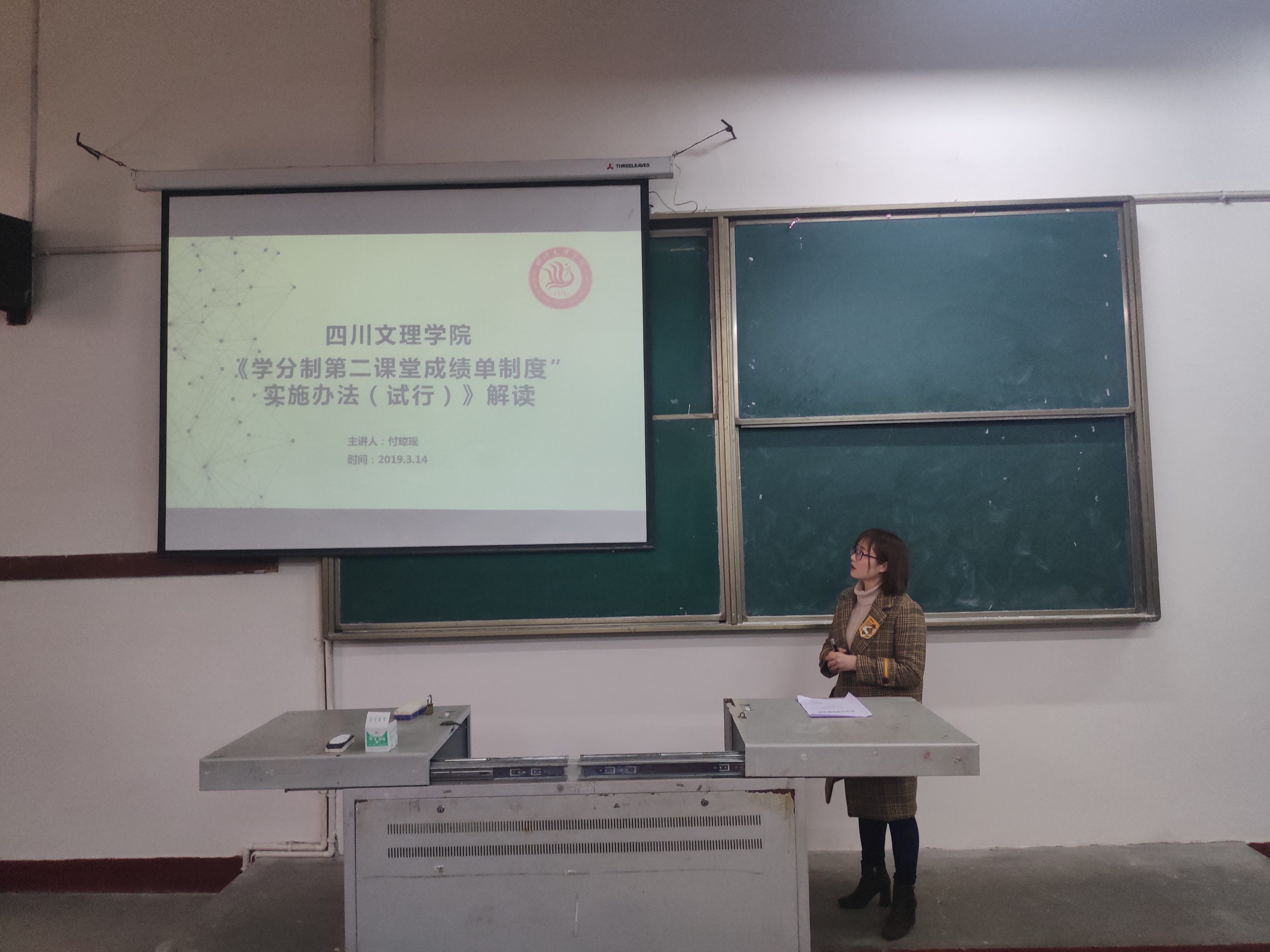 会上,付老师就“第二课堂成绩单”含义及推行原因进行了简要介绍。对“第二课堂成绩单”的内容、学分认证方法进行了全面深入的的解读,加深了同学们对“第二课堂成绩单”的理解。付老师结合公司《本科专业人才培养方案学分认定办法(试行)》的通知和《关于印发< “学分制第二课堂成绩单制度”实施办法(试行)>的通知》这两个文件为同学们详细讲解了“第二课堂成绩单”的认证方法、学分要求,并在此给出了获取学分、积分的建议。她还就PC版和手机版关于“第二课堂成绩单”的操作进行了说明。会后,仍有疑问的同学踊跃积极的进行提问,付老师耐心一一解答,并再一次强调了“第二课堂成绩单”的重要性。
