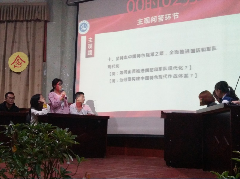 经过初赛的选拔,来自申搏sunbet2017级的五支代表队进入了决赛。比赛分为必答、选答和主观问答三个环节,围绕着十九大报告、习近平新时代中国特色社会主义思想、五四运动等内容展开。必答题中选择题和判断题由五个组轮流作答,而选答题和主观问答题根据当前总分高低来排列作答顺序,依次选择关于军事、环境、民生等七个方面的题型。主观问答,则由评委根据选手表现进行打分。比赛中,参赛选手沉着应对、密切配合,分秒必争,以饱满的精神状态,积极踊跃的回答每一道题,展现出了昂扬的斗志。比赛在主观问题环节达到了高潮。面对开放式的问题,在短的时间内,选手们周密思考,充分讨论,结合党的理论知识和对国家、社会、生活的感悟,认真作答,赢得了观众阵阵掌声。最终,经过紧张激烈的角逐,来自2017级4班的第四组代表队以206的高分获得了本次知识竞赛的第一名。