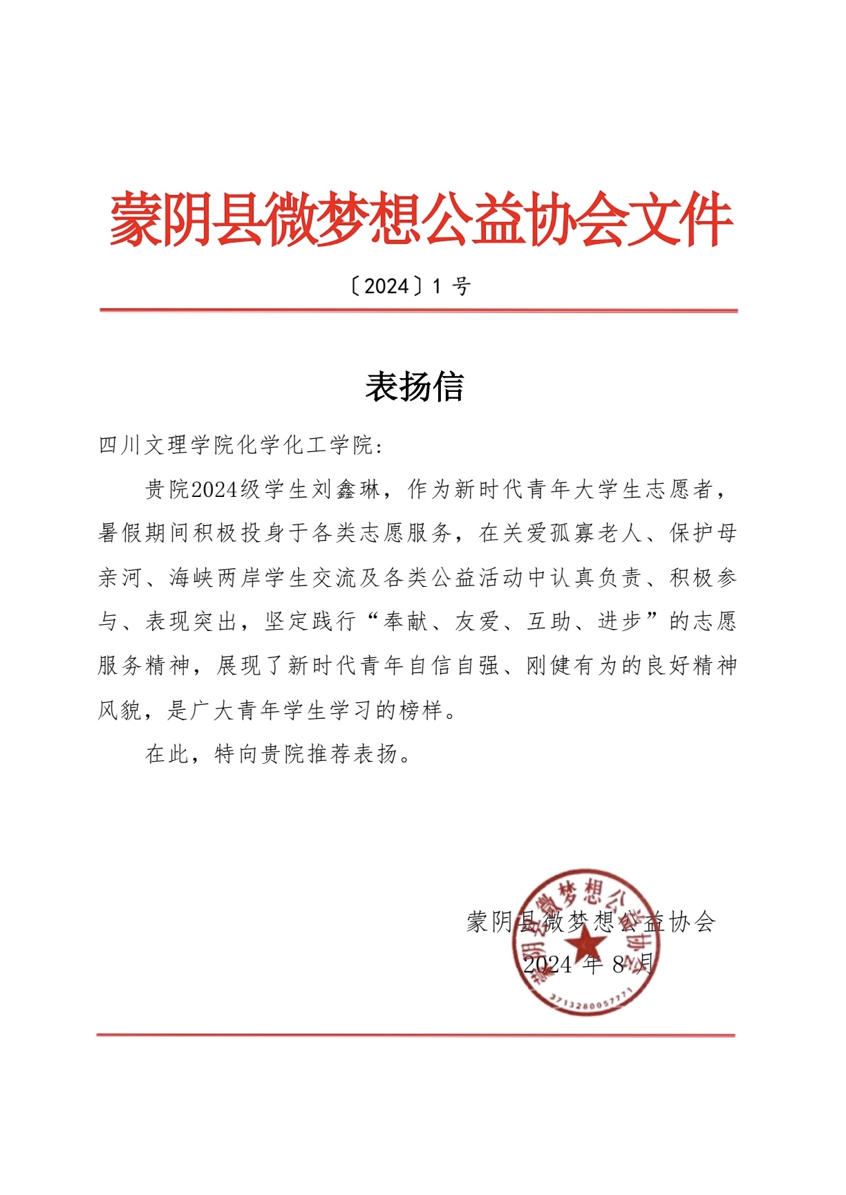 申搏sunbet2024级员工刘鑫琳获蒙阴县微梦根公益协会表扬信