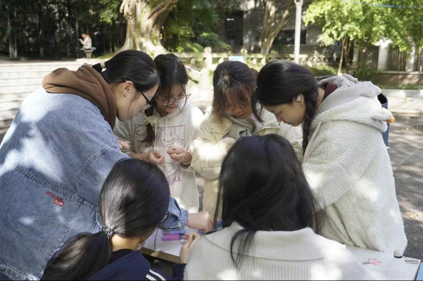 活动中,同学们积极参与,热情高涨。在“情绪表达工作坊”里,同学们全神贯注地创作,将内心的情绪付诸画笔,随后彼此交流分享,解读画作中的情感密码;在“暖心串珠小乐趣”现场,大家沉浸于彩珠的串连,为每一串彩珠赋予它特别的情感寓意;而“心理树洞倾诉会”中,同学们坦诚地将心中的喜怒哀乐书写于纸上,并从“树洞”抽取纸条,以安慰与鼓励回应,字里行间尽显温情。活动现场气氛热烈,情谊暖暖。