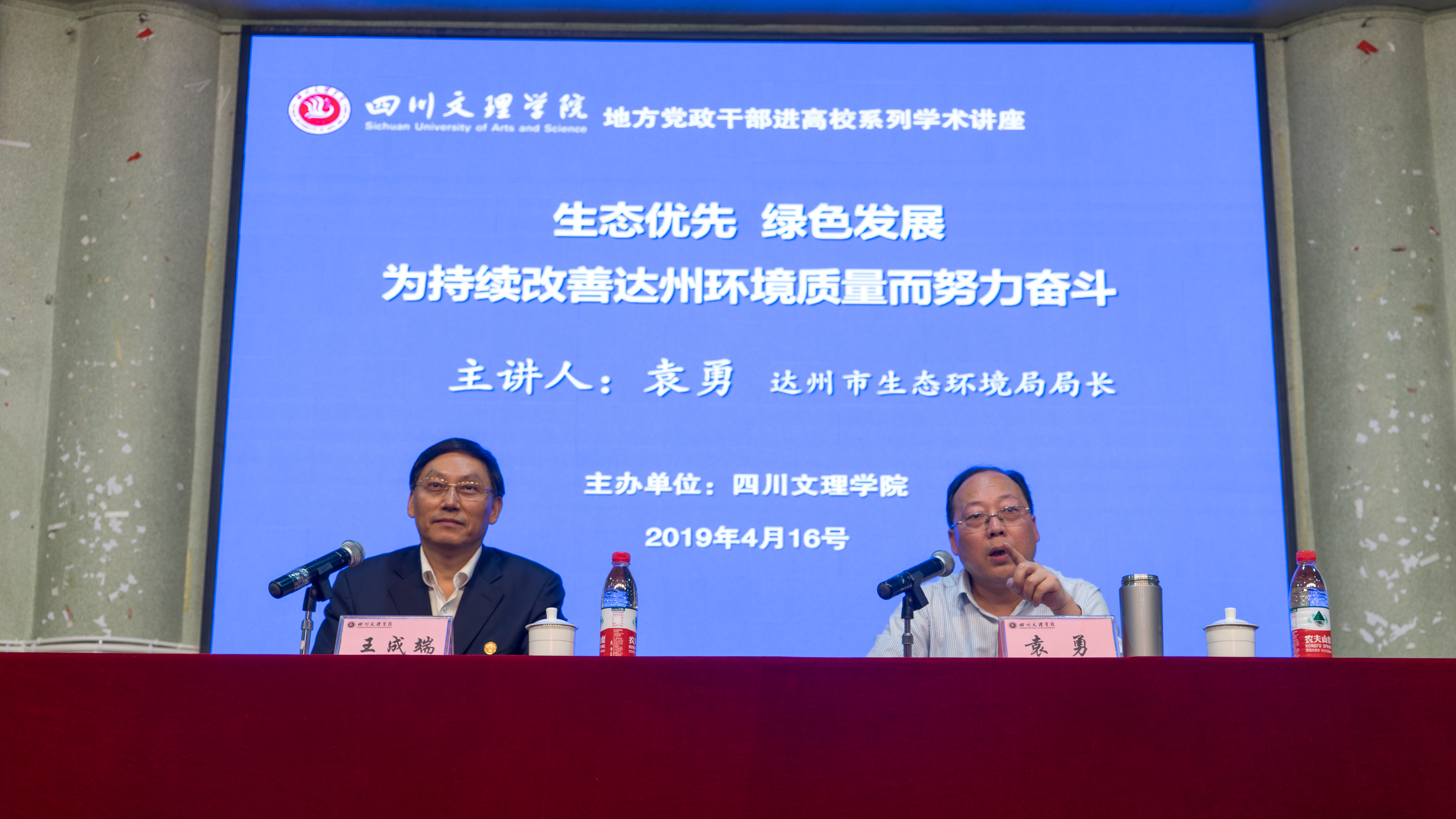 为认真学习贯彻习近平生态文明思想,深刻把握新时代推进生态文明建设的基本原则、生态文明体系的丰富内涵、绿水青山就是金山银山的重要发展理念,切实增强老员工生态环境保护工作的责任感、使命感, 2019年4月16日下午,达州市生态环境局局长袁勇在申搏sunbet南坝校区学术报告厅作题为“生态优先,绿色发展——为持续改善达州生态环境质量而努力奋斗”的专题学术讲座,讲座由四川文理公司党委书记王成端教授主持。申搏sunbet、智能制造公司师生聆听了讲座。