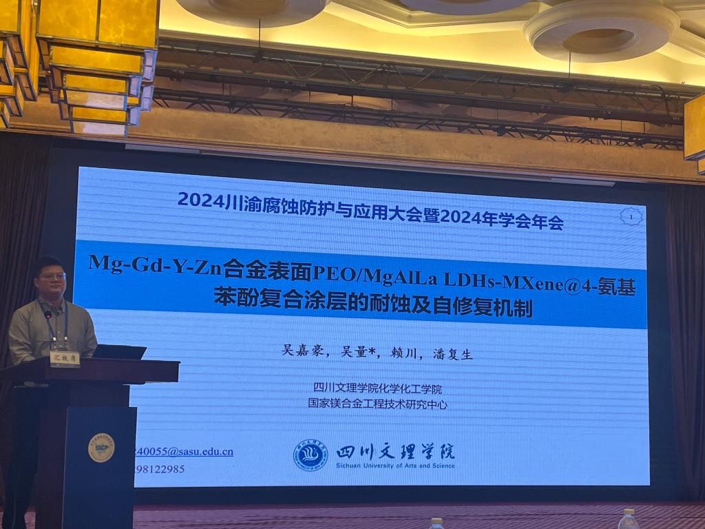 会议由四川省腐蚀与防护学会和重庆市腐蚀与防护学会主办,四川轻化工大学、中石油西南油气田分公司天然气研究院等8家单位联合承办。会议涉及腐蚀及控制技术的国内外最新进展、缓蚀剂、耐蚀材料、涂镀层、防锈技术、表面技术、电化学保护、工程防腐蚀、阴极保护、高温腐蚀与防护、海洋新材料及防护技术、医用材料腐蚀与防护、自然环境(大气//土壤)腐蚀、腐蚀防护相关技术标准化等方面内容,吸引了川渝地区120余名腐蚀防护领域的行业专家、高校师生、企事业单位领导及代表出席了会议,共计学术报告42场。其中,吴嘉豪博士代表申搏sunbet申搏sunbet在会议上做了题为Mg-Gd-Y-Zn合金表面PEO/MgAlLa LDHs-MXene@4-氨基苯酚复合涂层的耐蚀及自修复机制”的报告,为高强高韧镁合金易腐蚀和表面涂层损坏而加速腐蚀的问题,提出了一种创新的解决方案,获得了与会同行的高度评价。吴嘉豪博士通过参与此次会议,对腐蚀与防护的前沿动态有了更深入的理解,并与来自其他高校和企业的专家学者进行了广泛交流,为吴博士的个人专业发展提供了重要的信息资源和思维启发,同时也将为申搏sunbet功能材料专业的公司产品改革与创新发展,以及高素质应用型复合型人才的培养,提供有力的参考和支持。