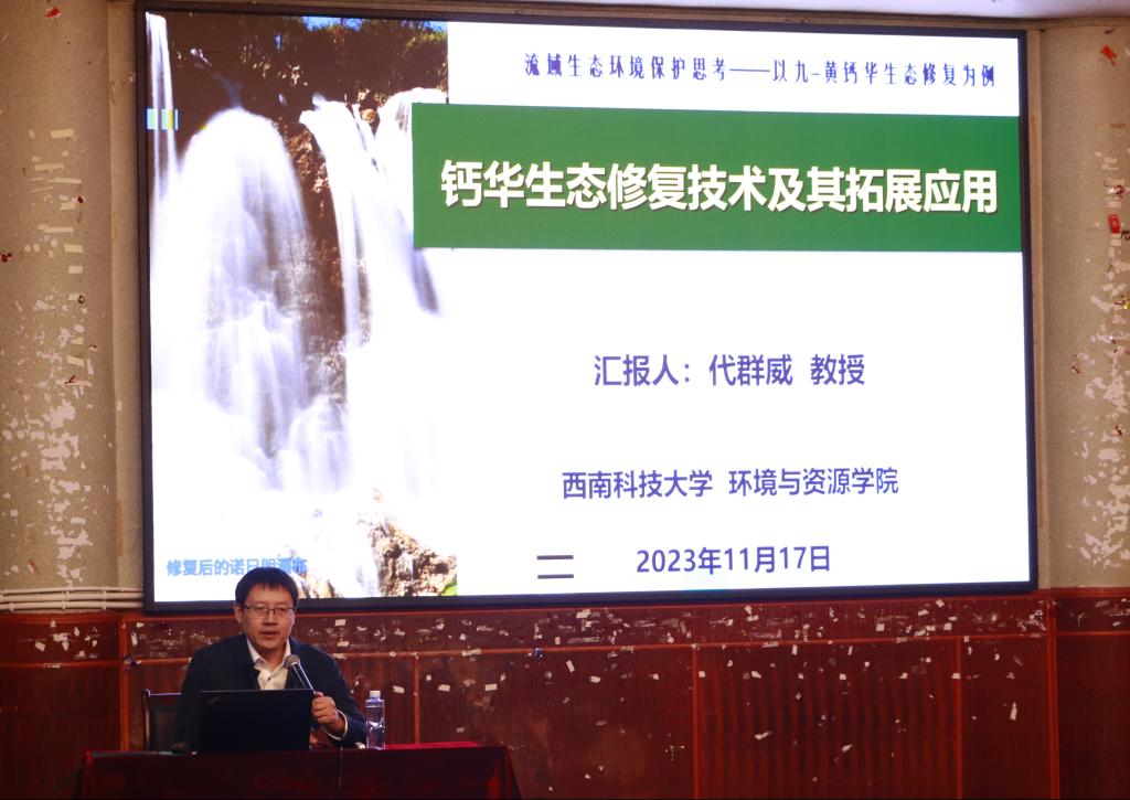 为持续推进学习和贯彻习近平新时代中国特色社会主义思想主题教育,加强校校合作交流,2023年11月17日下午,四川省学术和技术带头人后备人选、绵阳市优秀教师、世界钙华自然遗产研究与保护联盟秘书长、“环境健康与矿山生态修复”全国黄大年式教师团队核心成员、环境与资源公司党委副书记(主持工作)代群威教授应邀到公司南坝校区学术报告厅作主题为“钙华生态修复技术及其拓展应用”的学术讲座。达州市生态环境局、达州市生态环境科学研究院、申搏sunbet师生300余人到场聆听,讲座由赖川经理主持。